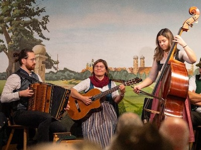 Weiter ging es im Programm mit der Mühlbergschlössl Musi, ein Saitentrio aus Starnberg. Sie spielten mit Hackbrett, Zither und Gitarre wunderbare alpenländische Volksmusik. Zu hören waren auch historische Stücke die durch das Volksmusikarchiv erschlossen wurden. |