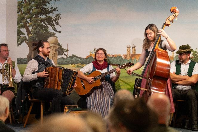 Mit einer lebhaften Polka eröffnete die Heuweg-Musi aus Karlsfeld den musikalischen Reigen. Vater Herbert Köhl eroberte mit seinen drei Buam Philipp, Markus und Felix im Sturm die Herzen der Zuhörer. Mit Gitarre, Klarinette, Ziach und Tuba unterhielten sie die Gäste mit traditioneller bayerischer Volksmusik aufs Beste. Ihren Gruppennamen benannten sie nach ihrer Wohnadresse, dem Heuweg. |