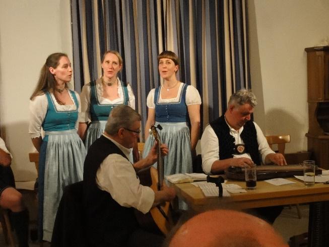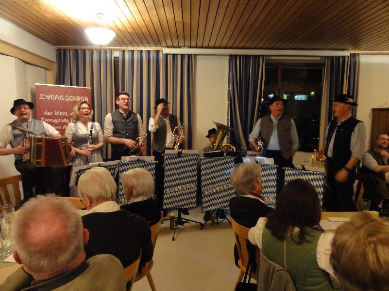 Da die Gaststätte Geisenbrunn wegen Sanierungsarbeiten ihren Betrieb unter neuer Leitung noch nicht aufgenommen hat, fand die Veranstaltung im Gasthof Schützenhaus in Gilching statt. Gestaltet wurde der Abend von der Gruppe „Mir san’s“ und den Gesangsduos „Zwoagschroa“ und „Buchsbaumer Zwoagsang“.