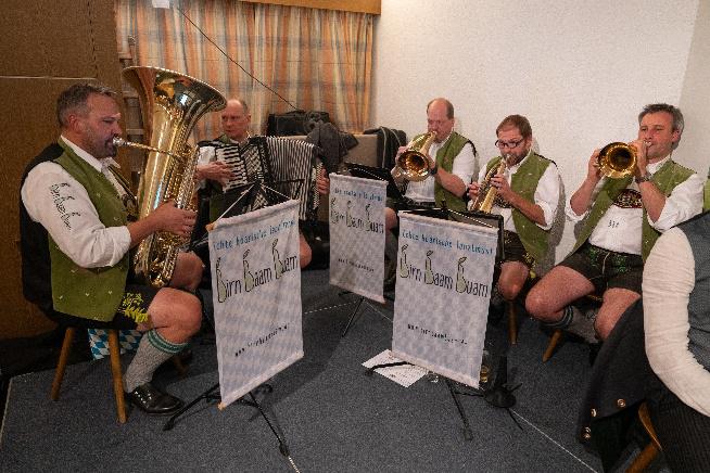 Mit dem Erzherzog Albrecht Marsch eröffneten die BirnBaamBuam den musikalischen Abend. Sie stammen aus dem Tölzer Landkreis und spielen das klassische Repertoire der ursprünglichen Tanzlmusi sowie speziell für die Besetzung mit Flügelhorn, Baßtrompete, Akkordeon und Tuba selbst arrangierte Stücke der böhmischen und mährischen Musik. Zahlreiche Eigenkompositionen im bayerischen Stil runden ihr Programm ab. Sie verwöhnten das Publikum mit ihren hervorragenden Darbietungen und glänzten mit musikalischer Präzision und ihrer unnachahmlichen Spielfreude. |